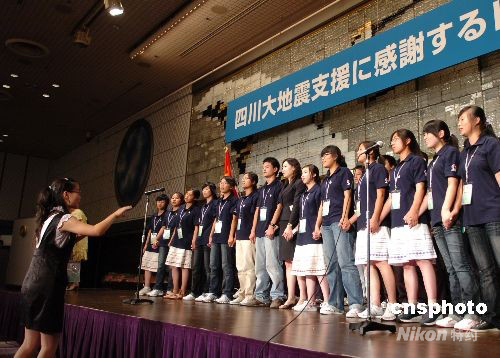 圖為正在東京參加中日青少年交流活動的二十余位來自四川震區的中學生,演唱歌曲《明天會更好》,以表達對日本人民的感謝和重建家園的決心。中新社發朱沿華攝