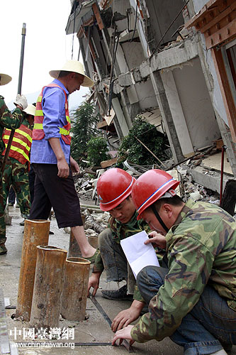 北川老縣城內,施工工人正在緊張忙碌,對傾危建筑進行加固作業,這里將建成地震遺址博物館。(中國臺灣網 鐘寶華 攝)