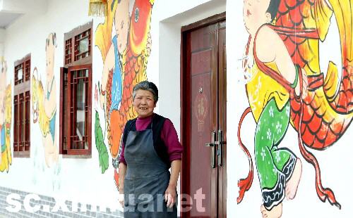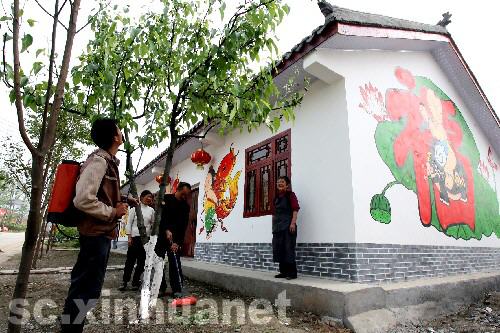 四川省綿竹市棚花村在汶川大地震中受災(zāi)嚴(yán)重。經(jīng)過(guò)近一年的重建,這個(gè)小村莊已重新煥發(fā)生機(jī),別具特色的年畫(huà)在新建的民房外墻上隨處可見(jiàn)。棚花村多年來(lái)形成了在墻上繪制綿竹年畫(huà)的習(xí)俗,地震前是遠(yuǎn)近聞名的旅游觀光村。