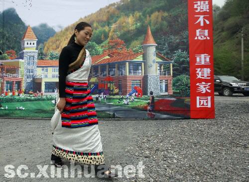 4月17日,在開工儀式現場,一名幼兒家長代表從臥龍鎮幼兒園效果圖前經過。新華社記者邢廣利攝