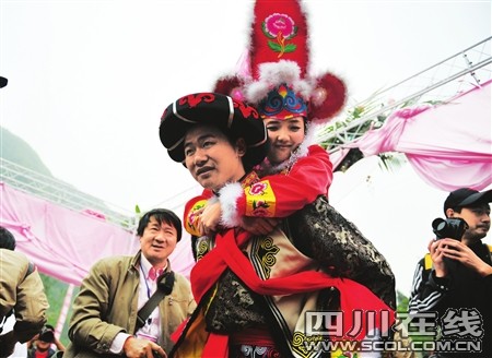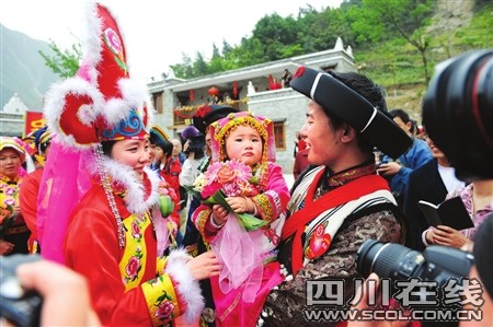 4歲的趙水銘穿著一身新嶄嶄的羌族童裝,走在吉娜羌寨廣場上很惹眼。清早7點(diǎn),還沒睡醒的她就被外婆叫起來,從綿陽市區(qū)趕來這里。“你來干什么啊?”“吃喜酒!薄俺哉l的喜酒?”“爸爸的!薄鞍职纸惺裁?”“趙欽!币蕾嗽谕馄抨悋频纳砼裕∷懨鎸︾R頭有些害羞!鞍职炙裉焐磉厱幸粋阿姨陪著,你認(rèn)得到嗎?”“認(rèn)得到!薄澳愫八裁矗俊薄叭龐!薄叭龐尯脝?”“好!毙∷扅c(diǎn)頭。外婆俯下身子,給小水銘整理被她弄歪的帽子,教她回答:“給記者叔叔說,三媽給水銘買零食,買玩具,買衣服,很好啊……”說這些話的時候,陳國云的眼中有淚光閃爍。她說,女兒遇難時還不到30歲,對女婿再婚,陳國云說她很高興,新娘子樸正英是北川人,十年前離異,大家知根知底!八撕芎,不錯的!闭f這些話的時候,陳國云的眼眶再一次濕潤,閃動著淚花。