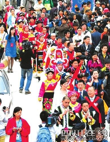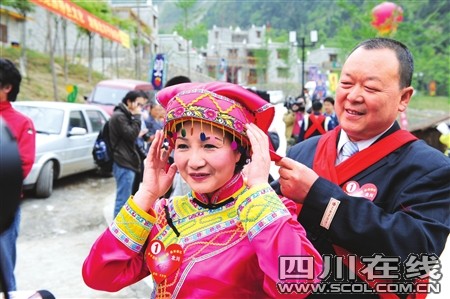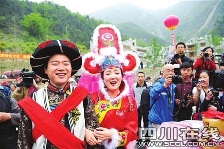 奔放的羊皮排鼓、迎客的朝天嗩吶、悠遠(yuǎn)綿長的羌笛,還有那羌族姑娘小伙深情嘹亮的對歌……昨日上午11:30,新聳立起來的擂鼓鎮(zhèn)吉娜羌寨,家家戶戶掛起了成串的玉米、辣椒;紅綢纏繞起羊頭骨、白云石和羌俗彩旗。20對北川災(zāi)后重組家庭新人在這里舉行集體婚禮,醇香的土壇咂酒裝滿了一只只喜氣洋洋的老碗,噴香的壩壩喜宴圍滿了四山八嶺來的鄉(xiāng)親……眾人齊祝福:“祝福這些歷經(jīng)苦難的人們,愿他們的未來幸福安康!”