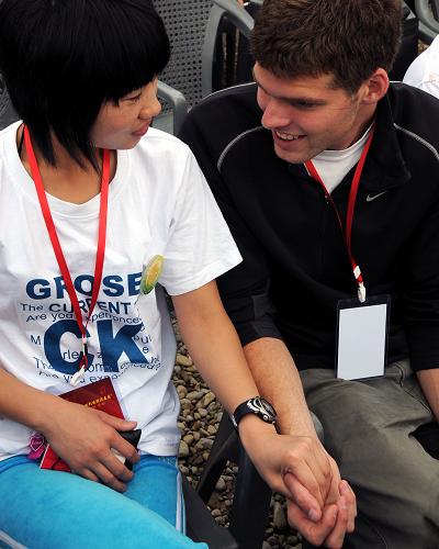 5月11日,在四川安縣“真情大愛·回到災區再看看”致謝活動現場,美國志愿者但以理和戀人、中國志愿者董明珠交談。兩人在去年地震災區志愿服務活動中相識相愛。時值汶川大地震一周年之際,但以理特意從美國飛回四川安縣,與在災區堅持服務了近一年的董明珠相聚,并在災區學校教孩子們學英語。新華社記者王茜攝