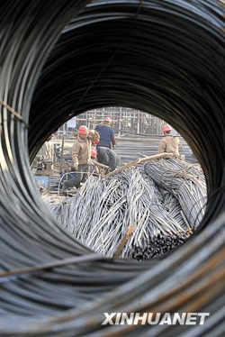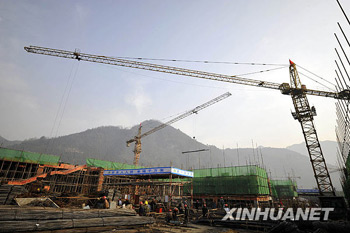 2009年1月12日,援建施工人員在北川縣擂鼓鎮(zhèn)小學(xué)工地上加緊建設(shè),3月底這所永久性學(xué)校建筑將封頂。新華社記者朱崢攝