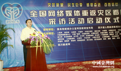 中國(guó)臺(tái)灣網(wǎng)5月8日成都消息 為銘記、見(jiàn)證并記錄地震災(zāi)后恢復(fù)重建的歷史,充分展現(xiàn)全國(guó)人民的無(wú)疆大愛(ài)、對(duì)口援建和災(zāi)后重建取得的顯著成效,由國(guó)務(wù)院新聞辦公室網(wǎng)絡(luò)局、四川省人民政府新聞辦公室主辦的“新生活·新希望·新發(fā)展”——全國(guó)網(wǎng)絡(luò)媒體紀(jì)念“5.12”汶川特大地震兩周年全國(guó)網(wǎng)絡(luò)媒體重返災(zāi)區(qū)看民生采訪活動(dòng),今日在成都正式啟動(dòng)。