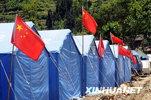 在四川青川縣板橋鄉(xiāng),救災部隊幫助鄉(xiāng)里搭建了帳篷學校,學校周圍插滿了五星紅旗(6月2日攝)。