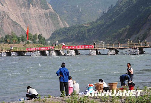 災區群眾在橋上掛上感謝解放軍的橫幅(6月2日攝)。
