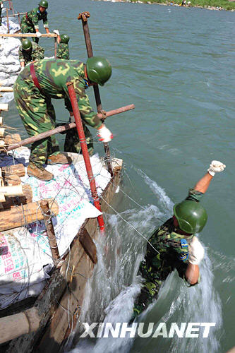 一名解放軍戰士徒手加固便橋(6月2日攝)。