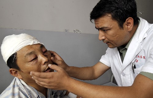 7月7日,位于烏魯木齊的解放軍第23醫院醫生阿克木江·阿西木在為傷員檢查。新華社記者 趙戈 攝
