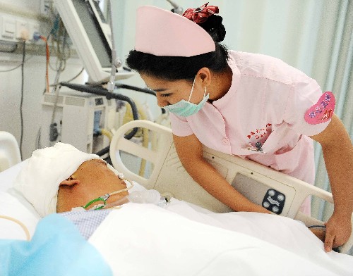 7月13日,新疆醫科大學第一附屬醫院的維吾爾族護士阿依古麗·阿巴斯在護理傷員。 新華社記者 沙達提 攝