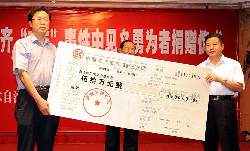 7月16日,國投新疆羅布泊鉀鹽有限責(zé)任公司總經(jīng)理李浩(右)代表公司向“新疆社會治安綜合治理見義勇為基金會”捐款50萬元。當(dāng)日,新疆社會各界為在烏魯木齊“7·5”事件中見義勇為的群眾踴躍捐款。新華社記者 沙達提 攝
