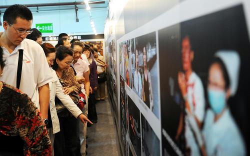 8月6日,觀眾在觀看平息“7·5”事件紀(jì)實圖片展。 新華社記者 沙達提 攝
