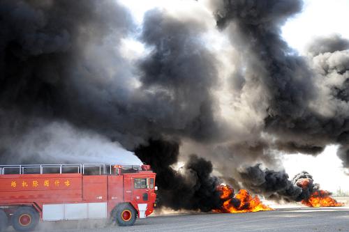 8月6日,一輛消防車在演習現場滅火。當日,新疆喀什地區應急辦和喀什機場等單位聯合舉辦機場處突應急救援綜合演習。演習旨在檢驗公安、武警和衛生等部門在突發狀況下的協同配合能力。 新華社記者 周文杰 攝