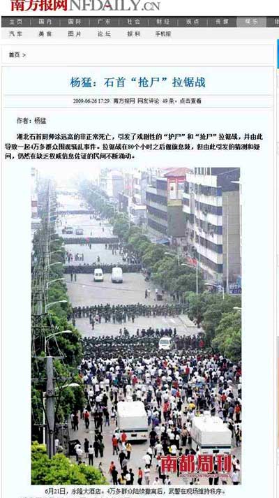 圖注:圖為國內(nèi)報紙刊發(fā)的湖北石首事件照片 圖片說明:6月21日,永隆大酒店。群眾陸續(xù)撤離后,武警在現(xiàn)場維持秩序