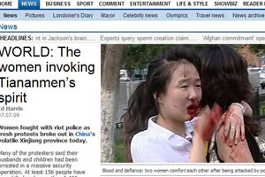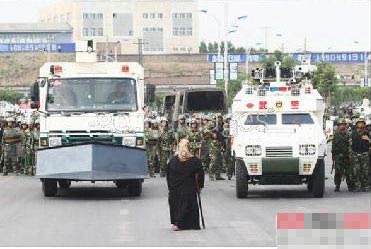 7月8日,英國網(wǎng)站monstersandcritics刊登了24張烏魯木齊騷亂的照片,在這些照片中,13張是全副武裝的中國士兵;5張是抗議和哭泣的少數(shù)民族,其中多張是婦女和兒童;漢人帶著防身器具上街游行的有4張;維族人看被推翻的汽車以及走過被漢人破壞的餐館各一張。整組圖片有意要透出什么信息不言而喻。