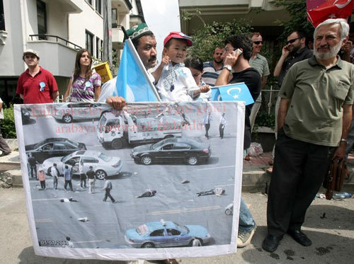 法新社7月8日發(fā)布一張圖片,圖片說明為“2009年7月7日,中國駐土耳其(安卡拉)大使館前發(fā)生示威,期間一位抱著孩子的示威者拿著美國維吾爾協(xié)會發(fā)布的一張圖片,圖片明顯展示出新疆暴亂的暴力受害者。”