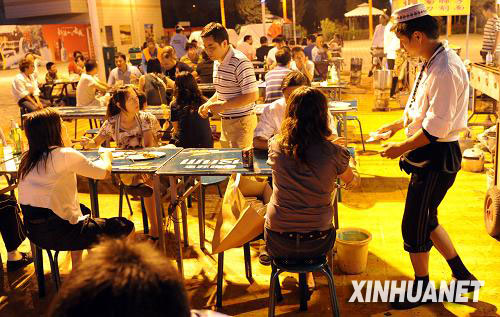 7月18日22時(shí)許,人們?cè)跒豸斈君R南湖露天夜市品嘗特色小吃。盛夏之夜的新疆烏魯木齊十分熱鬧,眾多市民和游客在露天夜市品嘗各類(lèi)特色小吃。新華社記者 沙達(dá)提 攝