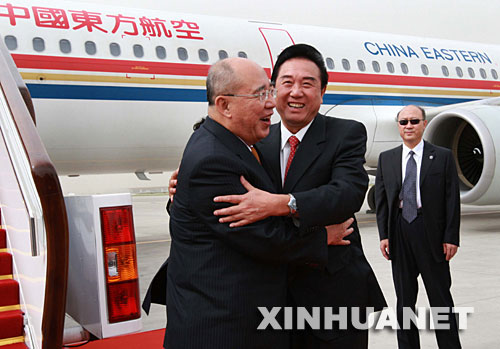 5月27日下午,中國國民黨主席吳伯雄率領中國國民黨大陸訪問團抵達北京首都國際機場。中共中央臺辦主任陳云林到機場迎接。 新華社記者 龐興雷 攝