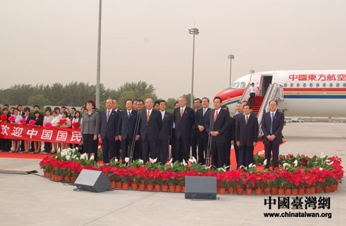 中國國民黨大陸訪問團一行,27日下午抵達北京首都機場。中臺辦主任陳云林及北京市委副書記王安順前往迎接。圖為歡迎儀式現場。中國臺灣網記者田云鵬攝