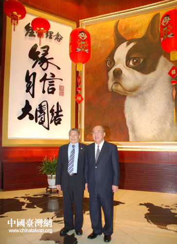 吳伯雄與蔡衍明,在蔡衍明幼時的愛犬“黑皮”畫像下合影。(攝影:中國臺灣網 田云鵬)