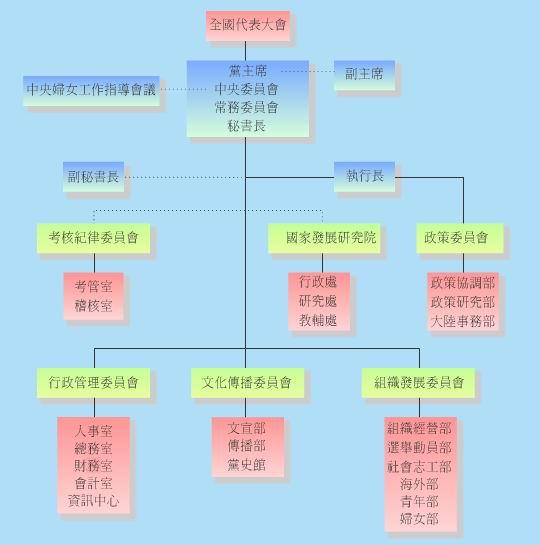 黨務(wù)主管:黃昭順、胡志強(qiáng)、洪玉欽、姚江臨、許顯榮、李紀(jì)珠、蔣孝嚴(yán)、李全教、曾永權(quán)、連勝文、洪秀柱、黃良華、盧秀燕、陳釘云、賴士葆、郭素春、林滄敏、帥化民、廖萬(wàn)隆、朱鳳芝、丁守中、蔣方智怡、侯彩鳳、紀(jì)國(guó)棟、謝坤宏、廖婉汝、周守訓(xùn)、潘維剛、徐中雄、華 真、賴調(diào)燦、黃執(zhí)中 |