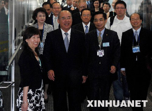 5月26日,中國國民黨主席吳伯雄(前右三)抵達香港國際機場。當(dāng)日,中國國民黨主席吳伯雄率領(lǐng)中國國民黨訪問團離開臺北,經(jīng)香港轉(zhuǎn)赴南京,開始為期6天的大陸訪問行程。 新華社記者公磊攝