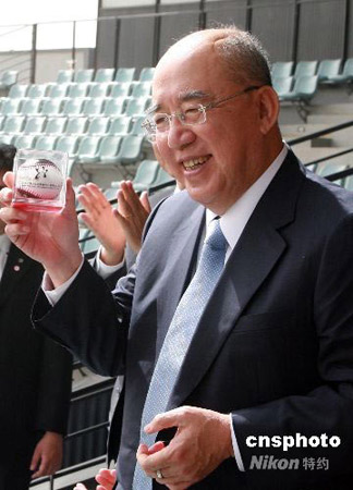 中國國民黨主席吳伯雄現場獲贈球場比賽開出的第一枚棒球作為紀念。 中新社發 廖文靜 攝