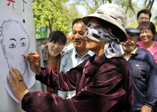 5月20日,74歲的康月蘭老人和社區居民在做畫鼻子游戲。當日,烏魯木齊市杭州路街道振興社區組織轄區內的部分殘疾人士和老人來到市植物園賞花、游園、做游戲,社區干部用這種特殊的形式為他們送去關愛與祝福。