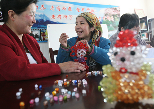 5月21日,社區工作人員在指導米娜娃爾制作手工藝品。烏魯木齊市沙依巴克區雅瑪里克山管委會殘疾人“陽光家園”自2009年11月成立以來,每天免費托管9名智殘人員在此接受認字、繪畫等輔助康復訓練。據了解,該家園還將啟動居家托養服務,使更多殘疾人受益。
