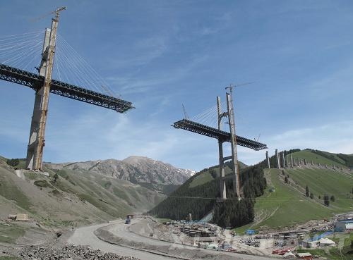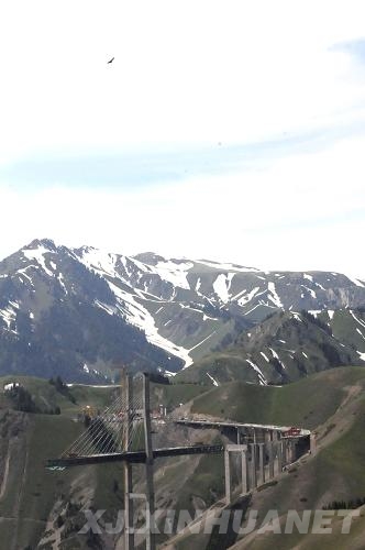 這是5月17日拍攝的正在緊張建設中的賽果高速公路(賽里木湖至果子溝)。