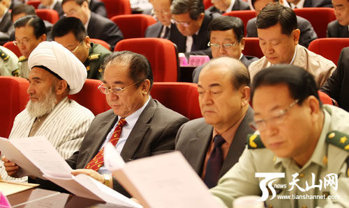 5月26日,自治區黨委七屆九次全委(擴大)會議在新疆人民會堂舉行。參加會議的代表認真聽取自治區黨委書記張春賢在會議上的報告。