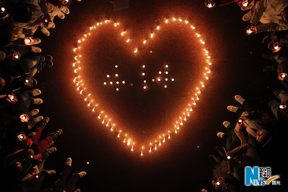 4月20日晚,江蘇省南通大學學生在“玉樹,我們一直在”祈;顒又悬c亮蠟燭,哀悼逝者。 新華社發(許叢軍 攝)