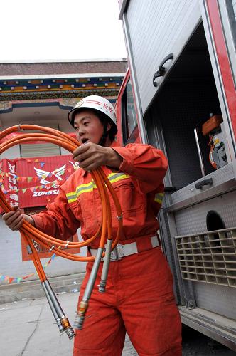 這是個只有15歲大的藏族小女孩。消防隊員立即將她抬上救護車。