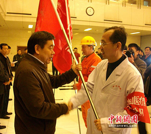 圖為河北省唐山市市長陳國鷹向趕赴青海玉樹災區救災的醫療專家吳碩嶺授突擊隊旗。