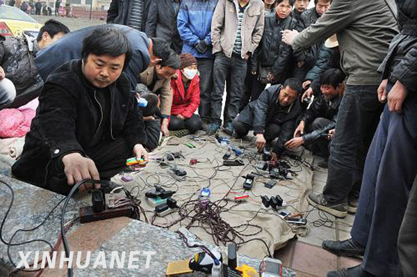 4月16日,唐全(前左一)在為手機充電。新華社記者 李紫恒攝 一場地震劫難,讓滋潤整個神州的“三江源”滿目瘡痍,遍地廢墟。 一場生死救援,讓災區的人民感受到無比的溫暖,創造著一個又一個奇跡。 與時間競速,和生命賽跑。在黃金救援期的第三天,全體中國人用行動書寫著對生命的尊重,彰顯了真情的無價。 生命大搜救 國際救援經驗表明,地震發生后的72小時是最關鍵的“黃金救援時間”。 4月16日,玉樹地震救援進入第三天,“黃金救援72小時”正一分一秒地無情流逝。在搜救現場,不少群眾翹首企盼新的生命奇跡出現。 沖刺,為了生命的奇跡。從黨中央、國務院到各地方各部門,從解放軍、武警部隊、消防官兵到公安民警,從專業救援隊到普通志愿者,從各級領導干部到廣大人民群眾……每一個人都在爭分奪秒,每一個人都在與死神賽跑。 4月15日下午,中共中央政治局常委、國務院總理溫家寶飛抵青海玉樹地震災區。他指出,當前,抗震救災第一位的工作是救人。只要有一絲希望,就要盡百分努力,堅持下去,決不放棄。 快、快、快!多爭取一秒就可能多搶救一個生命。 “我們的官兵們有的是剛拔了吊瓶,有的是剛剛嘔吐完,就立即趕往搜救現場,由于在高海拔環境下晝夜奮戰,很多人已經接近體力的極限。”青海消防總隊蘭州支隊的一個戰士剛剛從一個救援地點撤下來,嘴唇沒有血色,眼中滿是血絲,來不及向記者多說一句話,就匆匆趕往下一個傳出有生命跡象的救援地點。 一根根木樁被撬起,一塊塊礫石被挖出,一個個身影在閃動。16日,來自全國各地的近百支搜救隊在廢墟里展開拉網式排查,克服高原高寒和連續作戰等重重困難,突破體力和意志極限與時間賽跑,以期尋找生命的奇跡。 快、快、快!多付出一份努力就多一份生的希望。