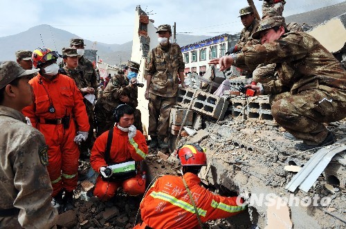 2010年4月18日,在青海玉樹地震災區現場,救援人員使用先進探測儀器,爭分奪秒搶救生命。 中新社發 章軻 攝