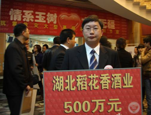 “情系玉樹、大愛無疆”抗震救災大型募捐活動特別節目在中央電視臺中央演播大廳舉行。湖北稻花香集團是湖北省參加本次募捐活動的唯一一家白酒企業,總經理蔡開云代表該集團為玉樹災區捐賑善款500萬元,寄托了所有稻花香人對玉樹災區人民的情誼和祝福。