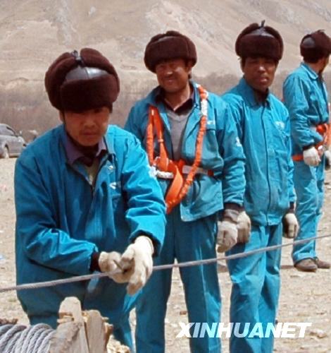 資料圖片:杜金玉(左二)和隊友們在玉樹災(zāi)區(qū)電力搶險現(xiàn)場拉電纜(4月18日攝)。新華社發(fā)(何青 攝)