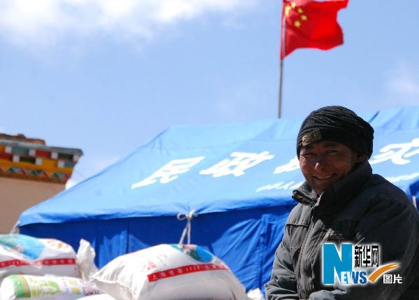 4月26日,一位玉樹縣隆寶鎮(zhèn)措桑村村民在救災(zāi)帳篷前露出微笑。 新華社記者 文貽煒 攝