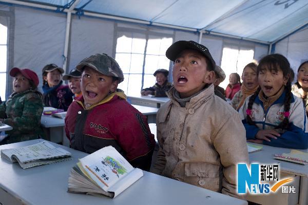 在玉樹隆寶鎮(zhèn)帳篷學(xué)校里,孩子們?cè)诮淌依锷险n(4月27日攝)。新華社記者 劉杰攝