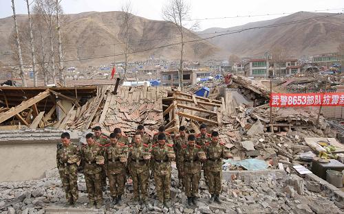 4月21日,青海玉樹“4·14”地震災區舉行哀悼活動,沉痛悼念地震遇難同胞。在玉樹結古鎮,參與抗震救災的武警官兵在廢墟旁為地震遇難同胞默哀。新華社記者周磊攝