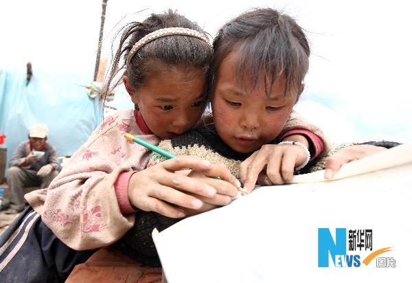 4月21日,俄德才仁的女兒成林巴措(左)在教妹妹認字。 家住玉樹結古鎮扎西大同村的俄德才仁在地震中失去了自己的妻子和遮風避雨的家,如今剩下6個未成年的孩子需要他一人獨立撫養。俄德才仁現在最大的愿望就是把房子的廢墟清理出來,在上面重新建起自己的家。 “估計什么時間能夠把這房子建起來?”記者問俄德才仁,“應該會很快,因為政府會幫助我們。” 記者 費茂華 攝