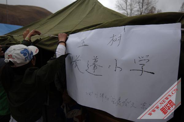 4月20日,在玉樹縣第二完全小學,志愿者將標牌掛在帳篷前。