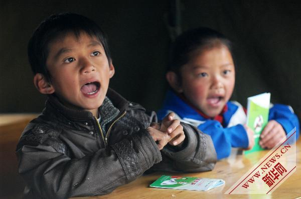4月20日,在玉樹縣第二完全小學,兩名學生在帳篷小學里讀書。新華社記者丁海濤攝