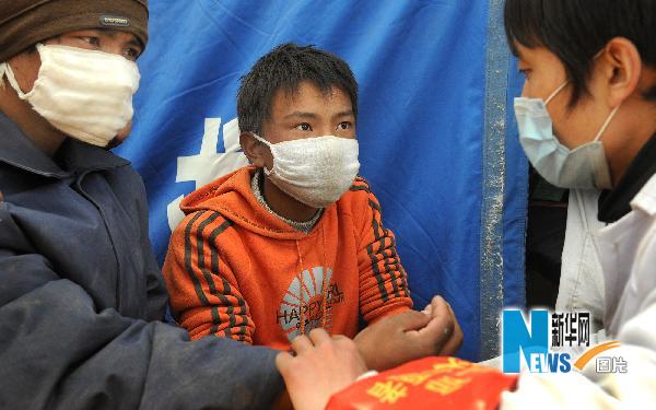 4月26日,玉樹第二民族中學(xué)生旦巴陽培(中)在為醫(yī)生診斷進(jìn)行藏語翻譯。新華社記者陶明攝