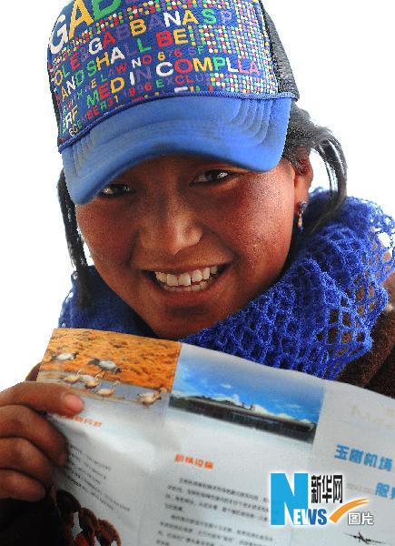 4月26日,手拿玉樹機(jī)場宣傳單、就要登機(jī)的才仁求吉小朋友非常興奮。當(dāng)日,青海省玉樹縣少兒福利院21名孤兒乘坐飛機(jī)赴西寧市。他們將開始在那里的學(xué)習(xí)生活。 新華社記者陶明攝