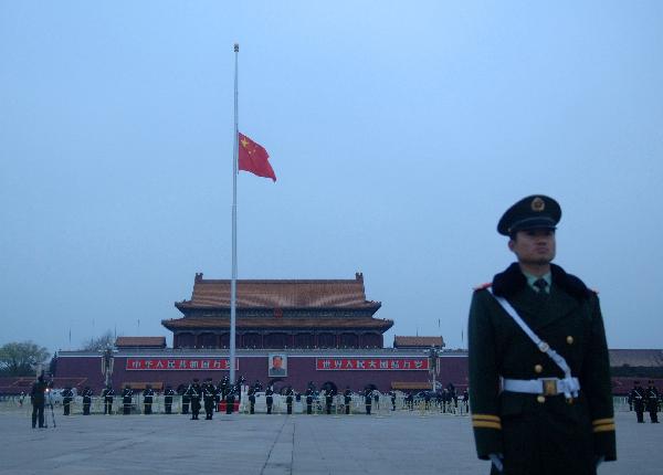4月21日,北京天安門廣場下半旗,向玉樹地震遇難同胞致哀。 新華社記者公磊攝
