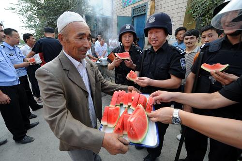 7月14日,居民阿米娜為特警隊員送上自己烤制的羊肉串。紅廟子平頂山是烏魯木齊市的一個多民族聚居區。“7·5”打砸搶燒嚴重暴力犯罪事件發生后,在此執勤的特警隊員們沉著冷靜地維護民族團結、維護社會穩定,及時化解民族矛盾,排除各種不穩定因素;利用一切時機深入各族群眾中,挨家挨戶耐心做思想教育和民族政策宣傳工作,幫助居民及時認清“7·5”事件真相和境外“三股勢力”挑起民族矛盾的險惡用心。不懈努力,逐散陰霾,各民族居民又開始相互往來交流,平頂山又恢復了往日的融洽與寧靜。而這些維穩使者們用行動和真誠贏得了民族聚居區群眾的信任,并與他們結下了深厚的友誼。新華社記者 李紫恒 攝