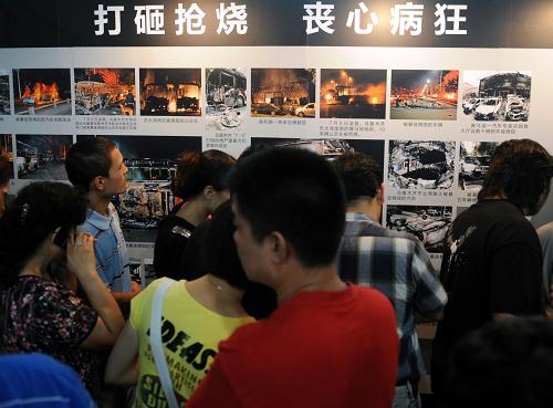 8月6日,觀眾在觀看平息“7·5”事件紀實圖片展。由新疆維吾爾自治區黨委、人民政府主辦的平息“7·5”打砸搶燒嚴重暴力犯罪事件紀實圖片展8月5日在烏魯木齊開幕,展覽共展出400多幅圖片,將持續到本月20日。 新華社記者 沙達提 攝