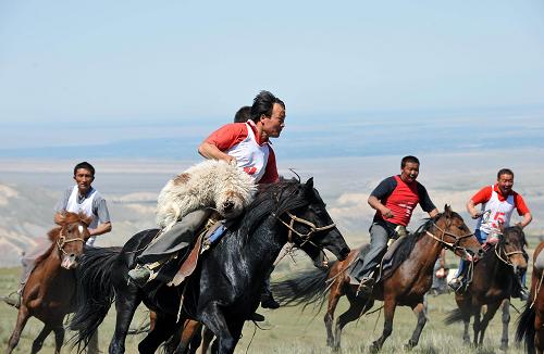 8月16日,選手們?cè)诩ち业牡鹧虮荣愔小?月16日,一場(chǎng)由哈薩克和蒙古族牧民參加的叼羊比賽在新疆烏蘇市天山腳下的賽力克提牧場(chǎng)舉行。叼羊是哈薩克族傳統(tǒng)的體育項(xiàng)目,為了增進(jìn)各民族的團(tuán)結(jié)和友誼,豐富農(nóng)牧民群眾的精神文化活動(dòng),當(dāng)?shù)孛磕甓寂e辦蒙古族的那達(dá)慕大會(huì)、哈薩克族的叼羊比賽和姑娘追等少數(shù)民族傳統(tǒng)體育活動(dòng)。新華社發(fā)(江文耀 攝)